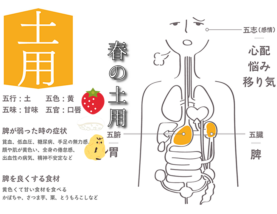 春土用の期間は、東洋医学では"気(エネルギー)の変わり目"とされ、体調や気分が不安定になりやすいと考えられています。特に「脾(ひ)」と呼ばれる消化器系の不調があらわれやすいとされています。「脾(ひ)」→「消化と栄養の司令塔」