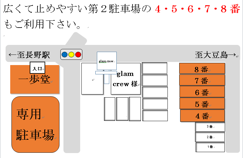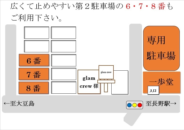 美容室グラムクルー様横に、第2駐車場もあります。4・5・6・7・8番(道路側から5台分。50メートルだけ院から離れていますが、駐車が苦手な方や大型車の方には広めで駐めやすいです)
